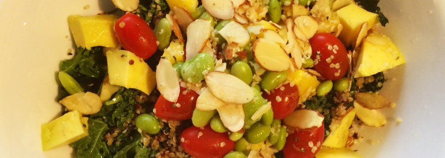With such an intense Yoga practice, I always make sure I'm getting sufficient protein in my diet. Here is a salad that is loaded with plant proteins and perfect for detoxing the body. Kale Quinoa Edamame Lima beans Mango Avocado Hemp seeds Tomato Almonds Lime Basil infused Evoo *I try and buy only organic.