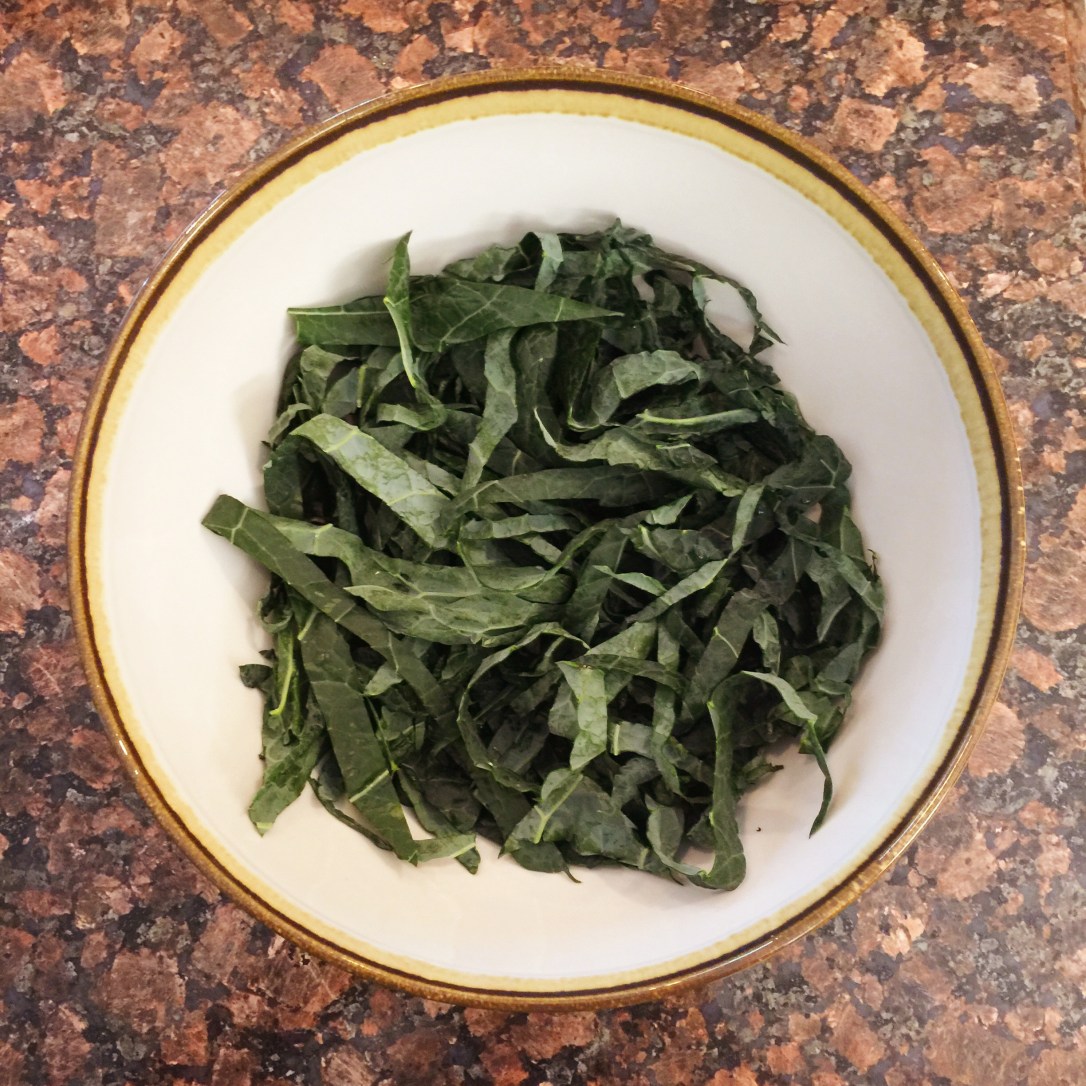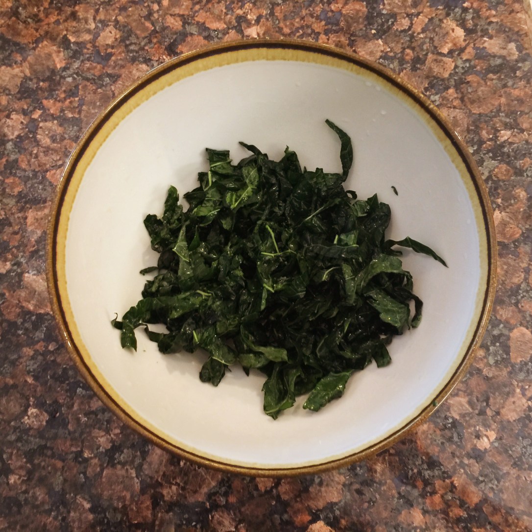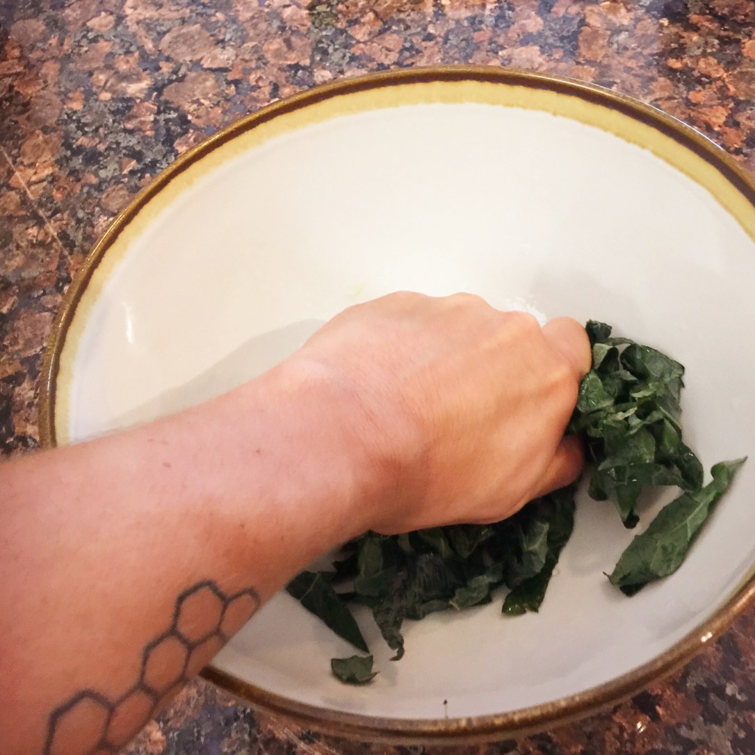 I rinsed and patted dry fresh organic kale. Discarded the stem in the center of each leaf, and sliced them thinly. In a large bowl I added the kale and squeezed a half of a lime over it. Then I began to massage the kale with lots of love. I like to speak to it and tell it how grateful I am for it to provide minerals and nutrients for my body.