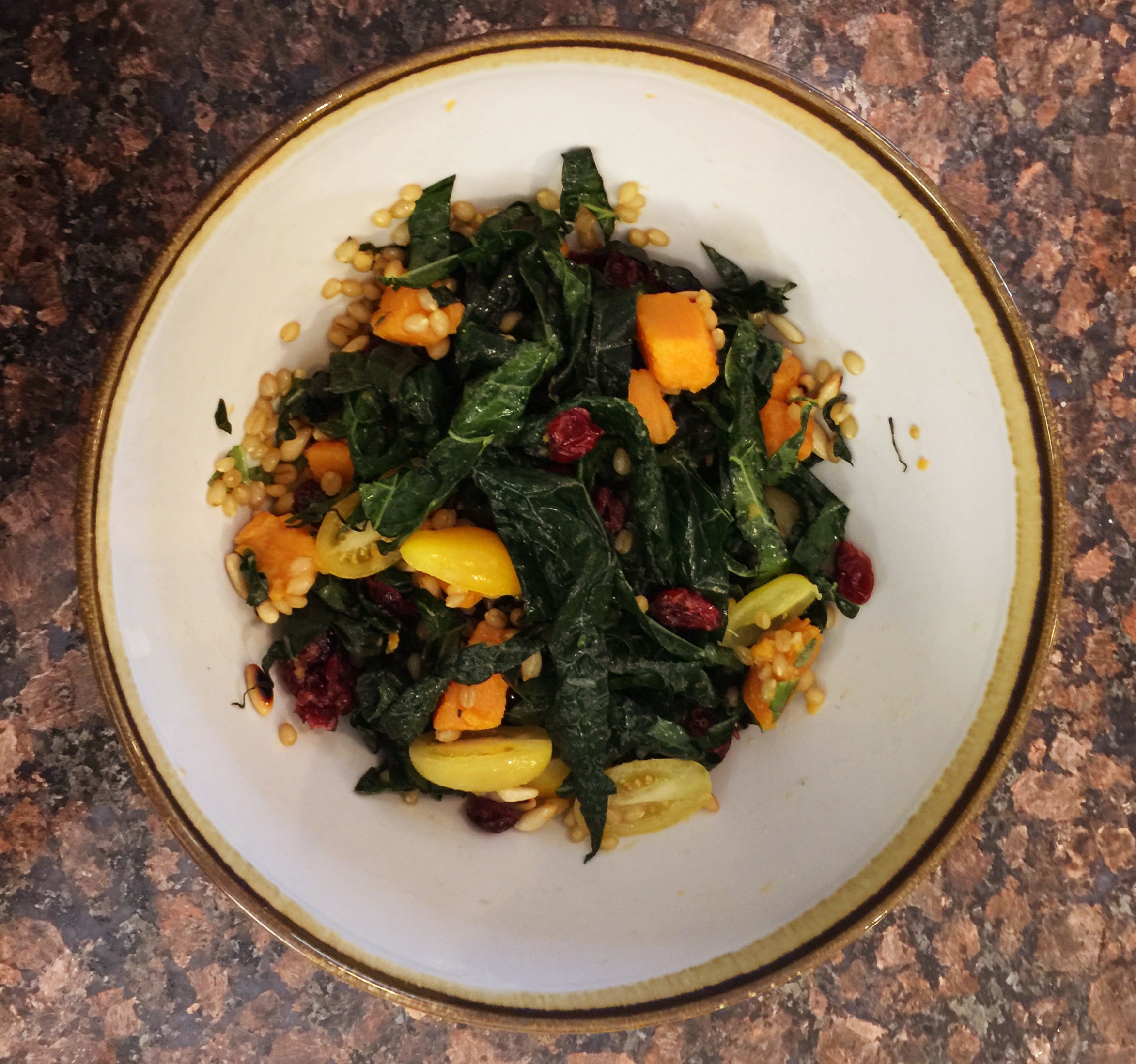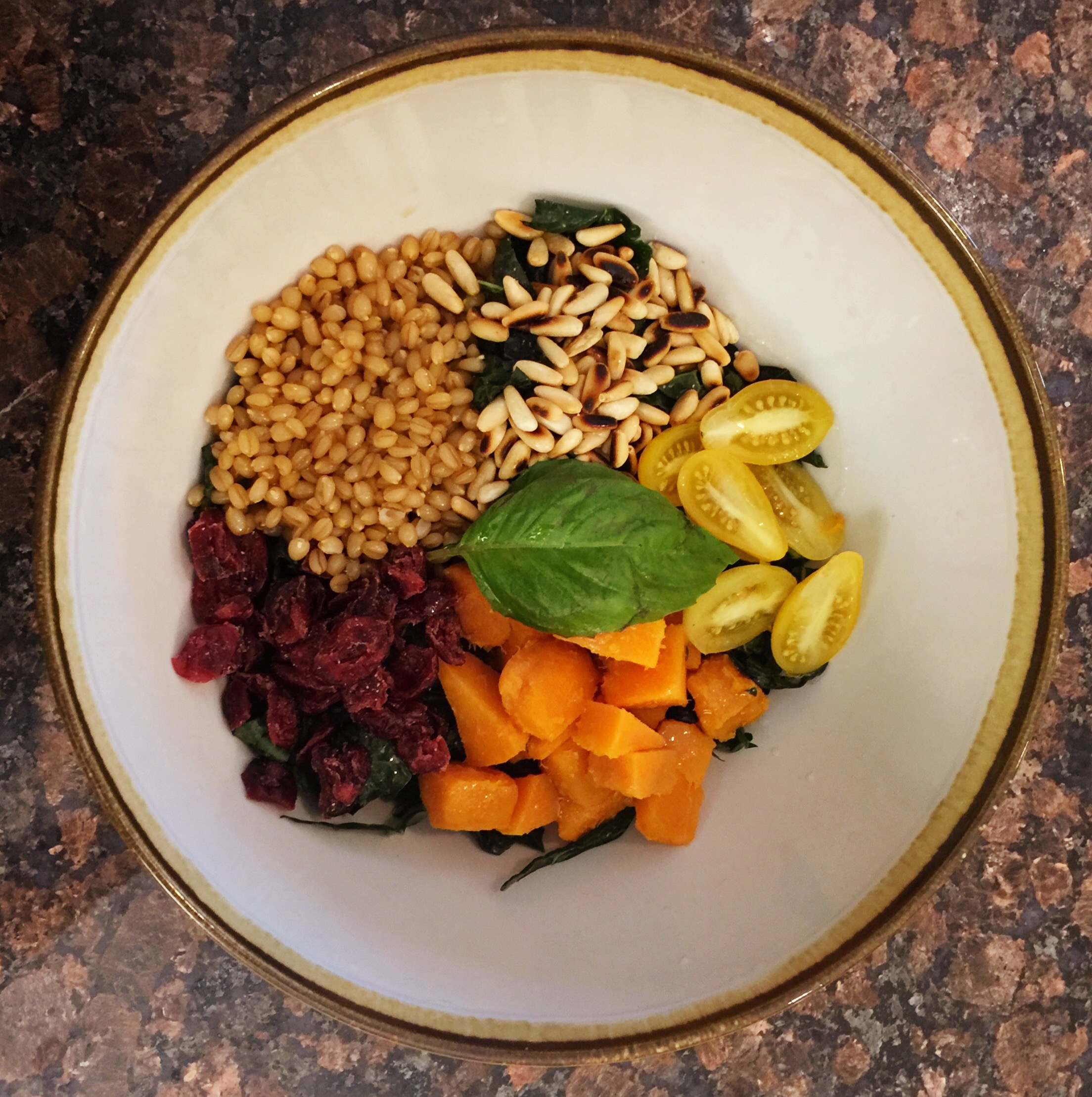 Then I roasted some pine nuts on the stove. And realized I had some wheat berries in the fridge that I had prepared the day before. If you have never used wheat berries, my suggestion is to get the soft ones not the hard ones. But it also depends on preference of texture. I soaked my berries over night (or at least 2 hrs) and boiled them the next day for 25 mins in water with salt. If you can’t find wheat berries, you can use quinoa, brown rice or barely. I added a handful or two of dried cranberries and some yellow tomatoes. I garnished it with a basil leaf and basil infused evoo.