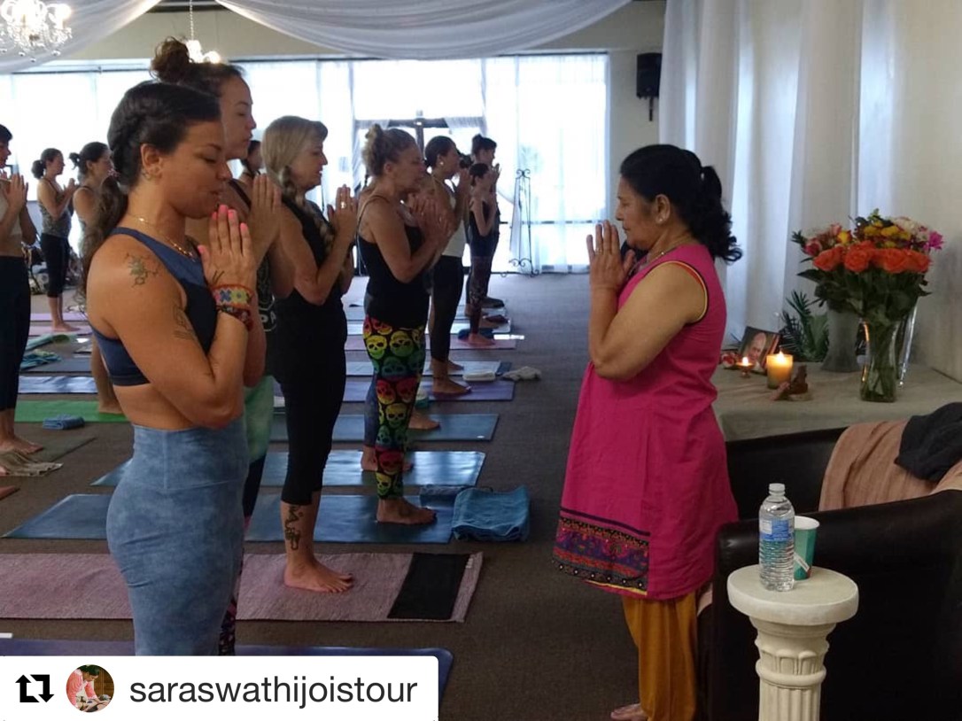As for my week of doing Ashtanga Yoga Led Full Primary Series with Sarawsathi for five days… it was amazing. Challenging, but amazing. I noticed she only assists those who really need the assistance. Making sure we are all using the correct technique. Making sure our dristhis are correct. Making sure you bind with the right arm and fold into padmasana with the right foot first. I got very little attention, which meant I was doing things correctly. Although I wanted to be touched by Saraswathi, I knew there was a reason behind her strategy. Everyday, I wondered if I would be so lucky as to feel the hands of this magical guru on me. Day 5, came and I still hadn’t been touched by Saraswathi. I gave up on the expectation. During the transition between Garbha Pindasana and Kukkutasana, rolling on our back in a 360 degree turn… I made it all the way around and she was still counting, so I took an extra roll back and got stuck on my shoulders in lotus position with my arms in between my legs. She had to stand up and help me roll back up on to my hands and held me up for the 5 breaths. Yay!!!! I finally got touched by Mother Saraswathi!!!! I swear my spirit guides knew how bad I wanted it and held me down so I would need her help. Or maybe I subconsciously sabotaged myself in order to get her to touch me lol who knows!!! Either way, I finally got touched on the last day of the tour and I was so happy ๐ She is so soft yet powerful. I swear she used the force to hold me up. It was almost like she was barley touching me but I felt so supported. After practice, we got to eat some delicious food made by Sam at saturday_sweets/IG and then had a lecture where she talked about her father and his journey into Yoga. She also spoke of the last moment she had with him while passing in her arms. As you can imagine, that set off the water works ๐ญ She expressed to us how important practicing Yoga daily is. She said “one day skip, you pain”, “two days skip, even more pain.” It was all very simple and a lesson in humbleness. I will always remember this experience and can’t wait till I can go see her in the Shala in India ๐ฎ๐ณ ๐๐ผ