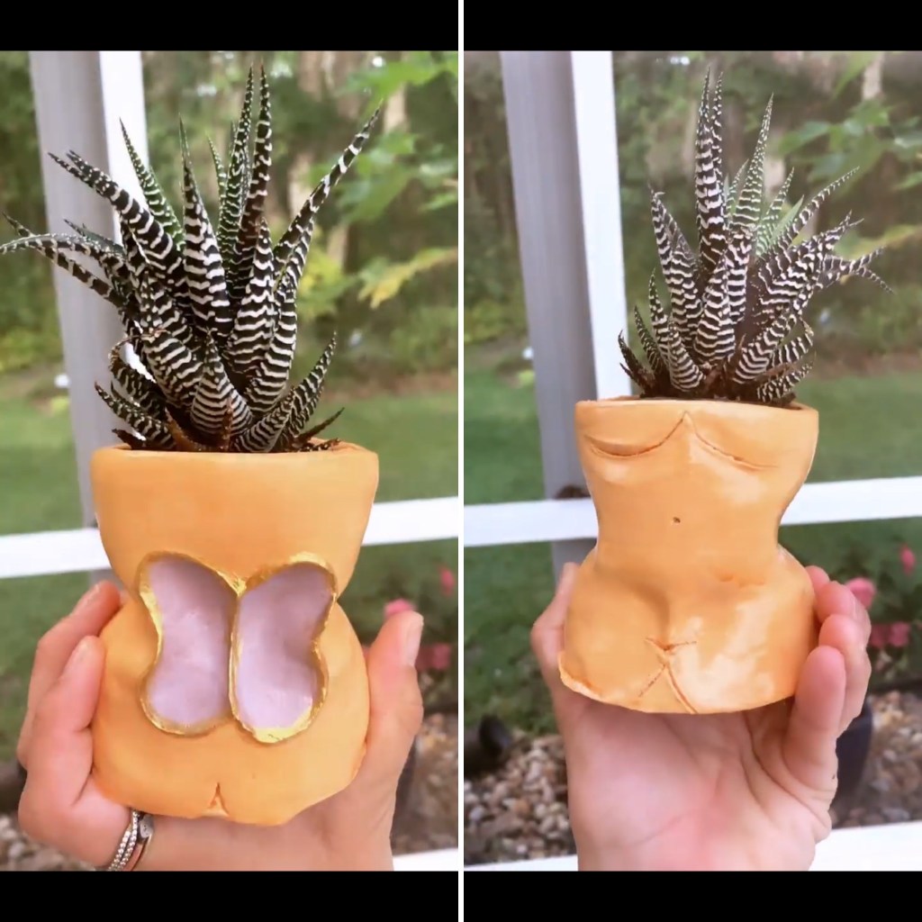 My next piece was a funky little piece that just kind of came about. I was feeling very inspired by the naked female body and I wanted to create an open container like vase of the torso of a woman. It ended up that the bottom half looks like the face of a pussy cat. 😻 Meow! And of course I had to give her wings 🦋 This little succulent added to the vase just adds the finishing touch 😉